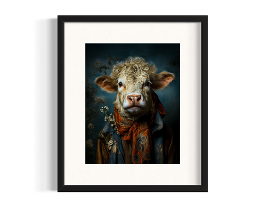 Rustic Cow in Elegant Attire Art Print